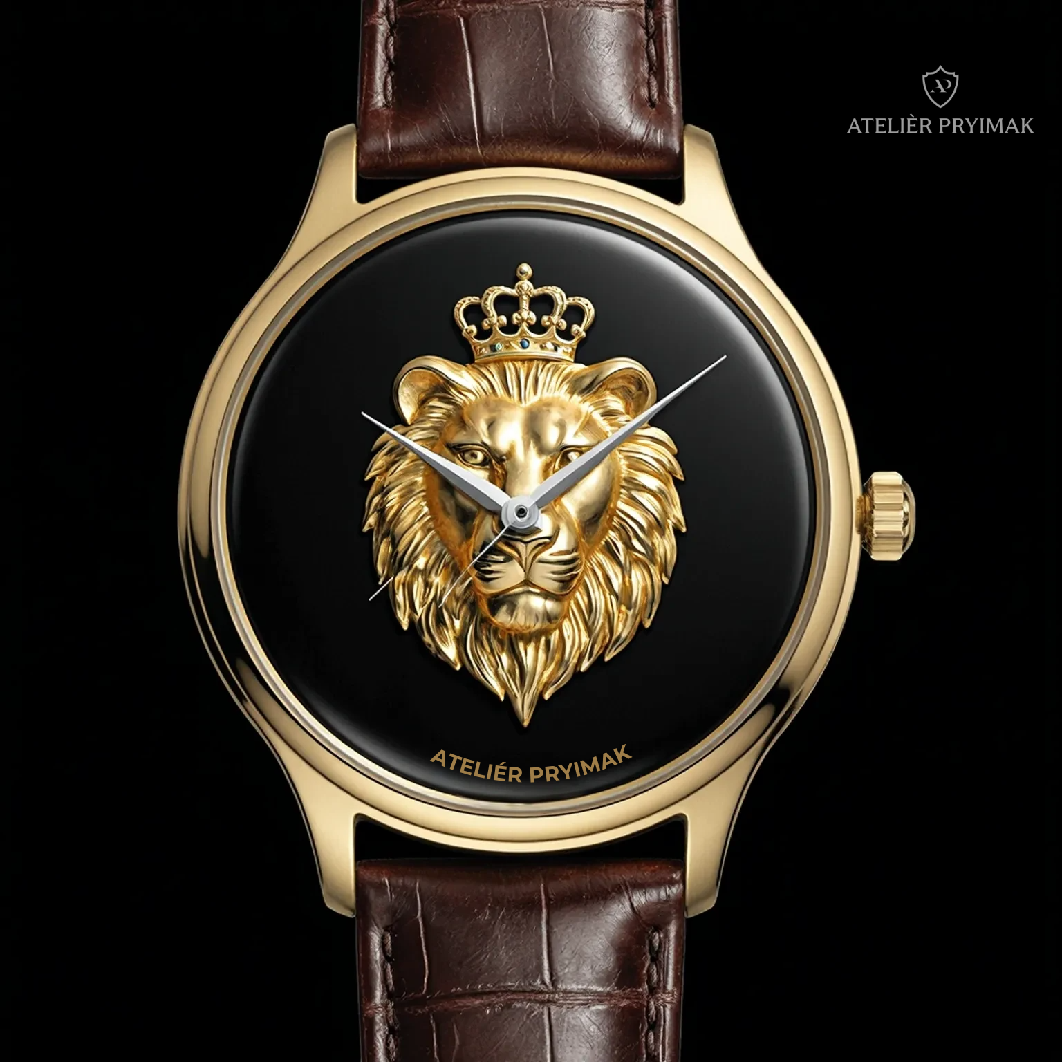 Hlavním prvkem hodinek je jedinečný reliéfní číselník, zdobený plastickým vyobrazením českého lva s korunou, které je vytvořeno s vysokou úrovní detailů. Hluboké černé pozadí z leštěného onyxu dodává číselníku výraznost a luxusní vzhled. Nápis „Ateliér Pryimak“ podtrhuje exkluzivitu a původ těchto hodinek.