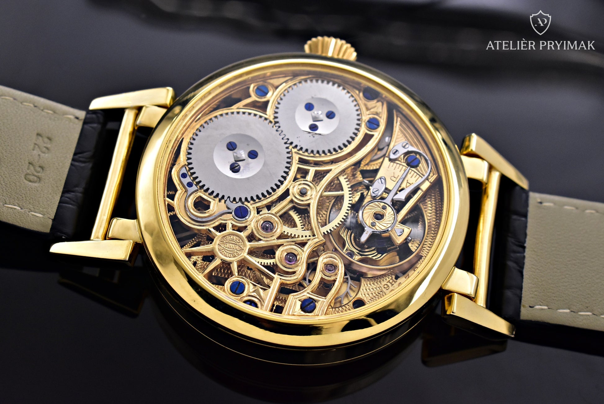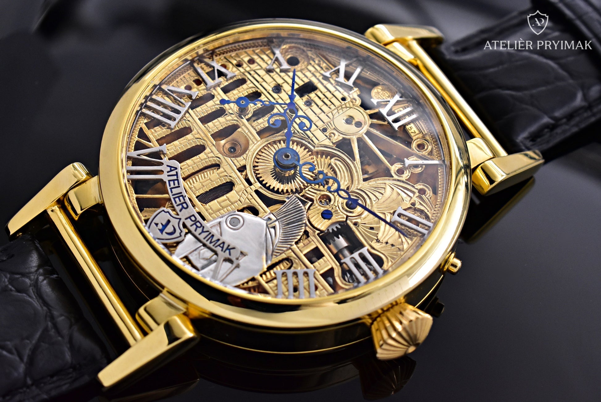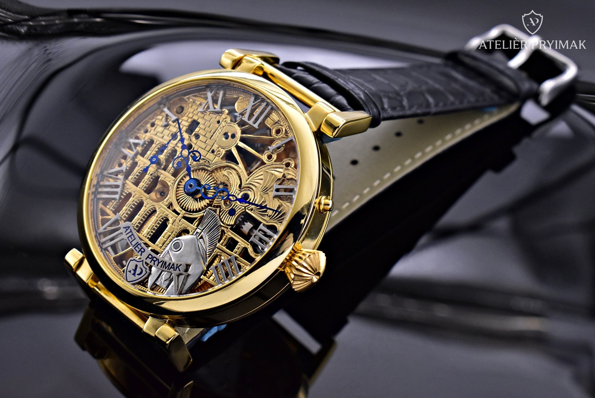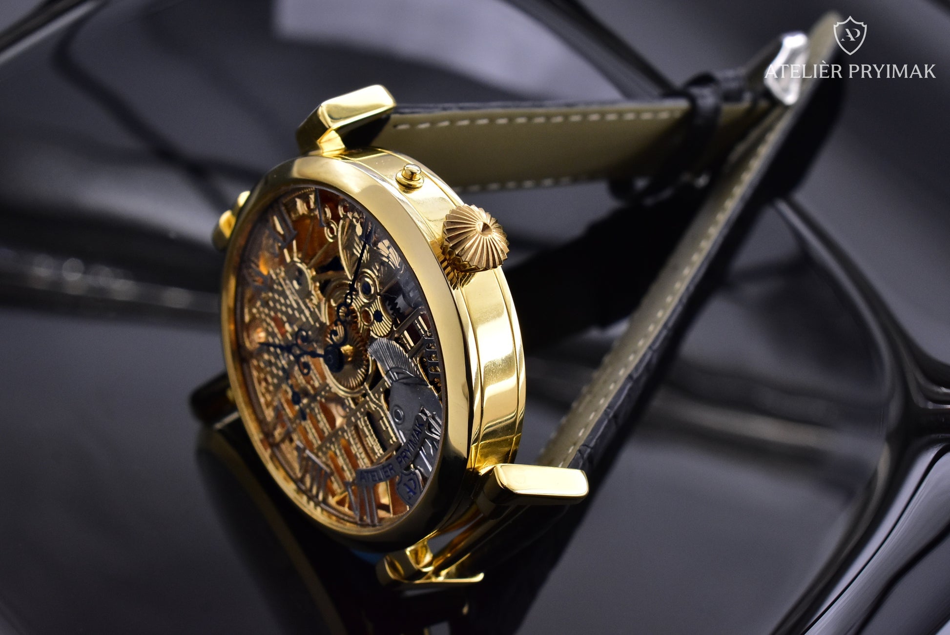 Představuje vám příležitost stát se majitelem jediného exempláře IWC Schaffhausen "GLADIÁTOR" 1926, tyto hodinky jsou výjimečným kouskem, ručně vyrobeným v Ateliéru Pryimak a existujícím pouze v jednom exempláři. Každá vteřina je cenná – a s těmito hodinkami ještě více. Nabízený mechanický starožitný strojek špičkové švýcarské značky IWC Schaffhausen kalibru IWC 52, se sériovým číslem 829884, vyrobený v 1926 roce ve Švýcařsku. Byla provedená celková umělecká ruční skeletonizace s vyritím římského koloseumu a gladiátorské přilby Maximus přimo na strojku. Po skeletonizací strojku všechny díly byly upraveny, začištěny, přebroušeny a povrchově upraveny zlacením a stříbřením. Skeletový ciferník ve tvaru římských čislíc. Šroubky byly pokoveny do modra. Specialně pro tyto hodinky bylo ručně vyrobené pouzdro z klenotnické mosazi a 24kt zlacením což zajišťuje hodinkám luxusní vzhled a jedinečnost. Hodinky jsou po generalním servisu a jsou přesně jdoucí s průměrem bez korunky 48mm.