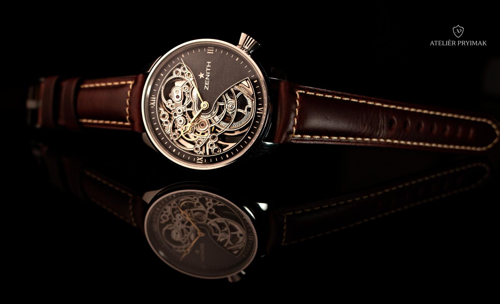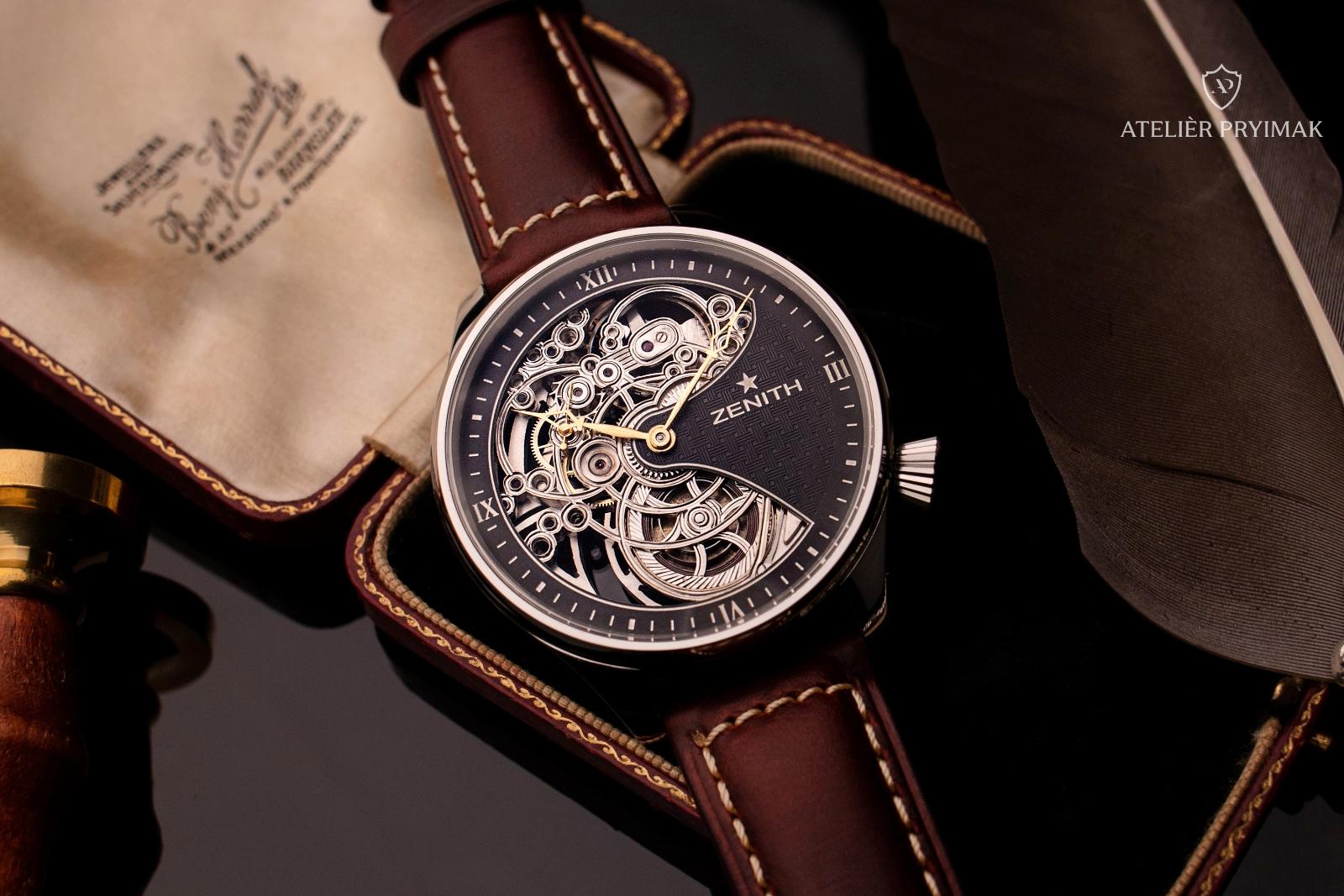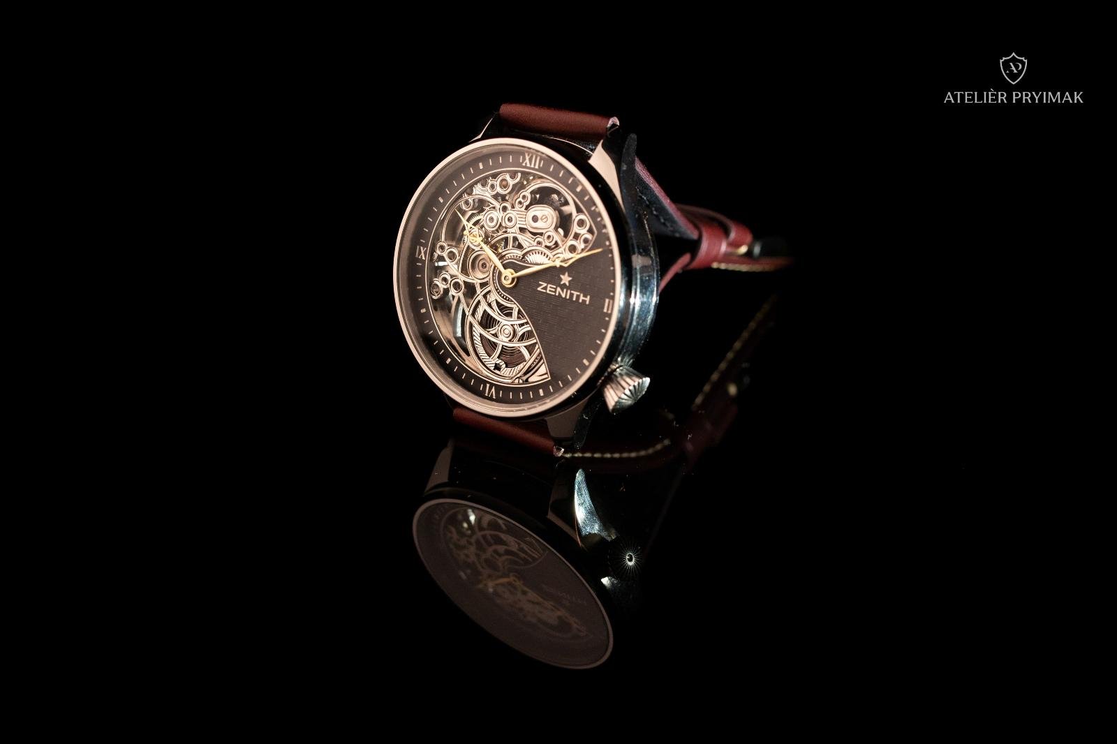 Nabízený mechanický starožitný strojek špičkové švýcarské značky ZENITH. Byla provedená celková umělecká ruční skeletonizace v vesmírném stylu. Po skeletonizací strojku všechny díly byly upraveny, začištěny, přebroušeny a povrchově upraveny rhodováním a take šroubky byly pokoveny do modra.