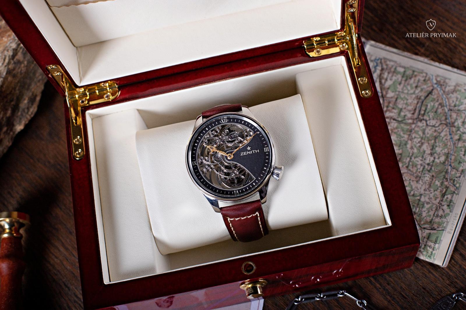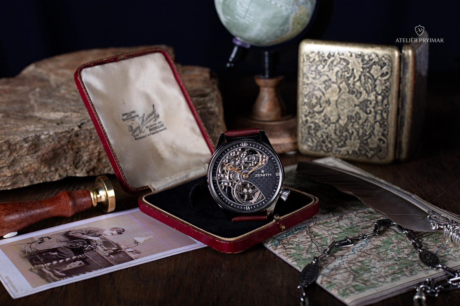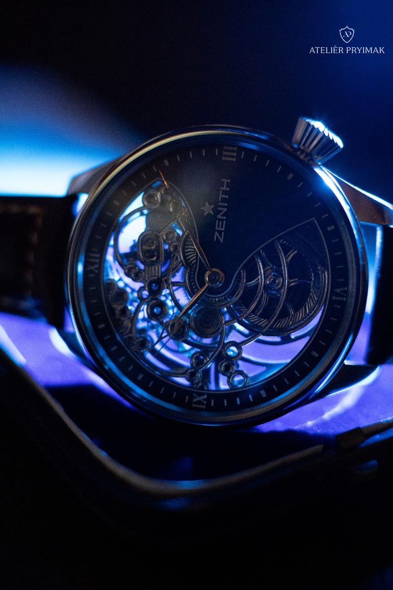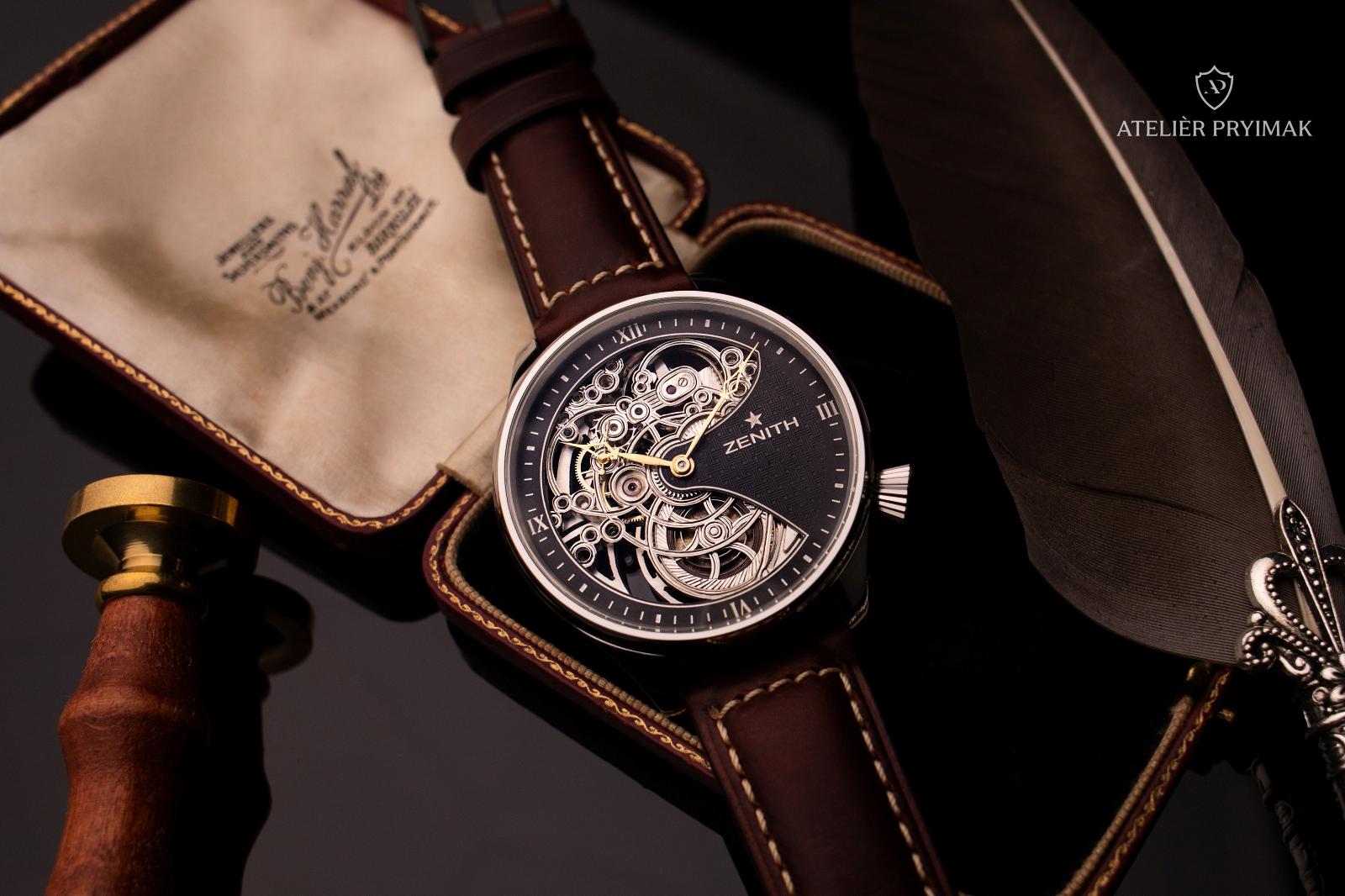 Nabízený mechanický starožitný strojek špičkové švýcarské značky ZENITH. Byla provedená celková umělecká ruční skeletonizace v vesmírném stylu. Po skeletonizací strojku všechny díly byly upraveny, začištěny, přebroušeny a povrchově upraveny rhodováním a take šroubky byly pokoveny do modra.