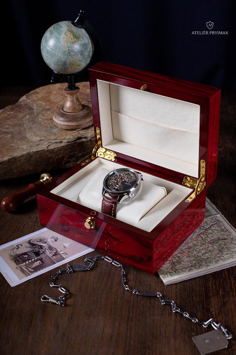 Hodinky jsou včetně dárkové dřevěné lakované krabičky.