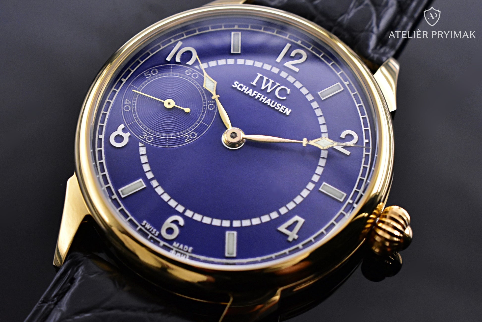 Zrestaurovaný modrý plechový ciferník s gilošovaním, plastickými číslicemí a elegantnimí zlacenými ručičky je v bezvadném stavu.