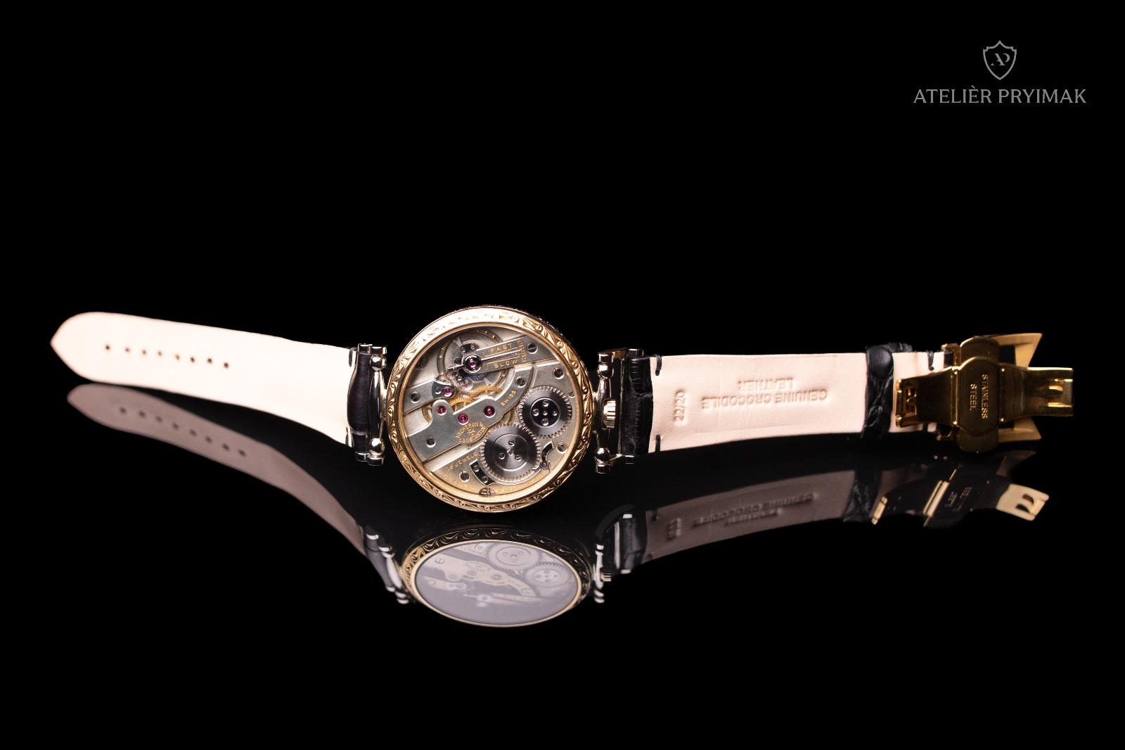 Speciálně pro tyto hodinky bylo v našem ateliéru ručně vyrobeno pouzdro z klenotnické mosazi, zdobené jemným ručním gravírováním s kombinací stříbření a zlacení, což dodává hodinkám luxusní vzhled a jedinečný charakter. Průměr pouzdra bez korunky je 45 mm.