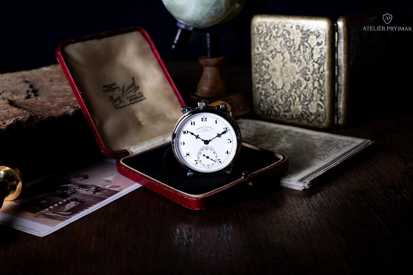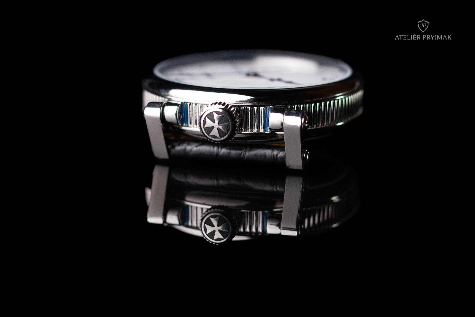 Speciálně pro tyto hodinky bylo v našem ateliéru vyrobeno pouzdro z nerezové oceli, které harmonicky doplňuje celkový vzhled a nese v sobě historický charakter celého díla. Průměr hodinek bez korunky 45mm.