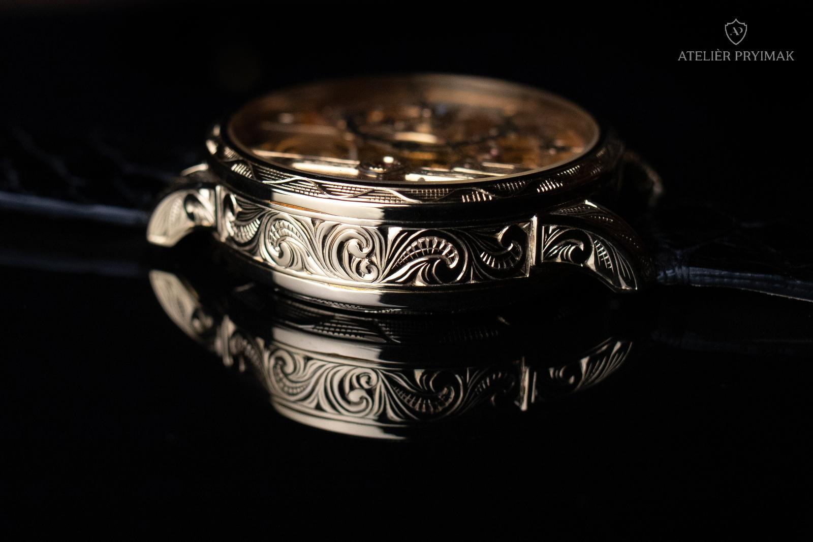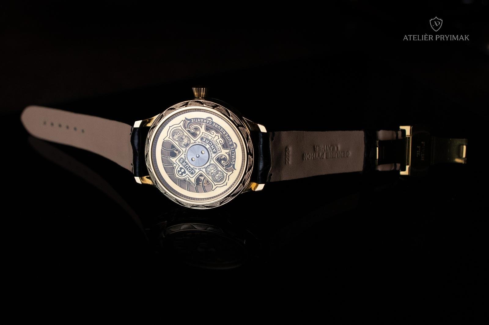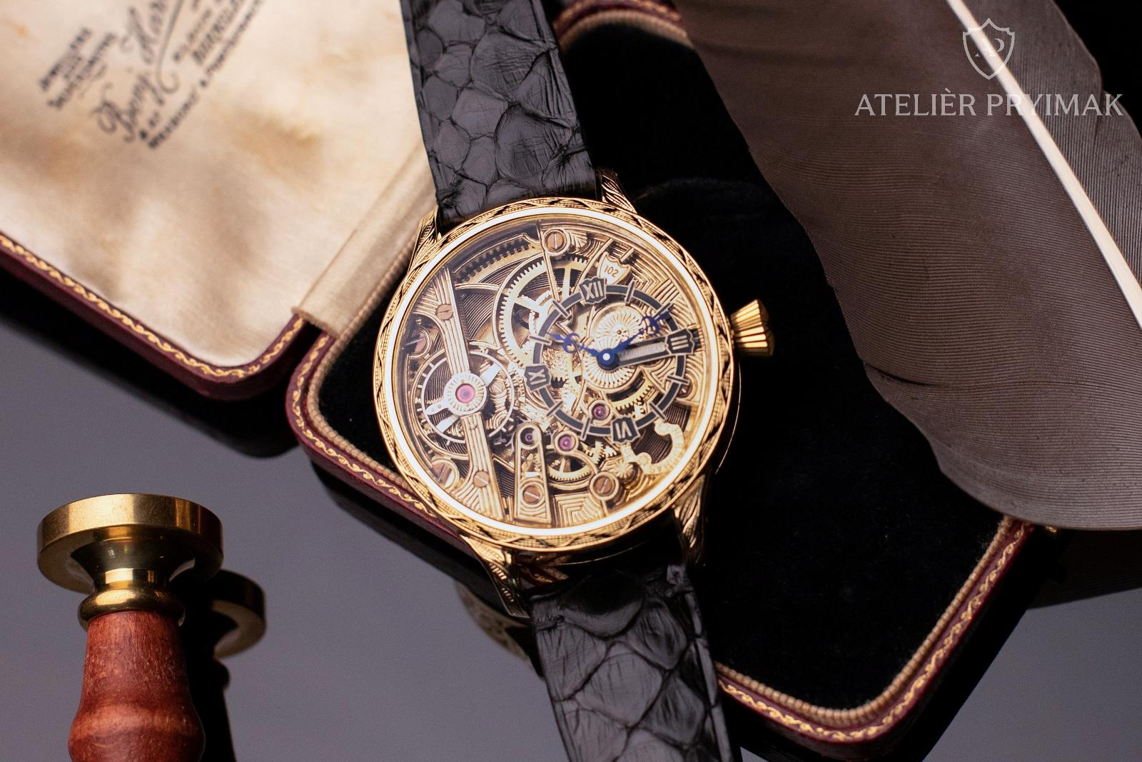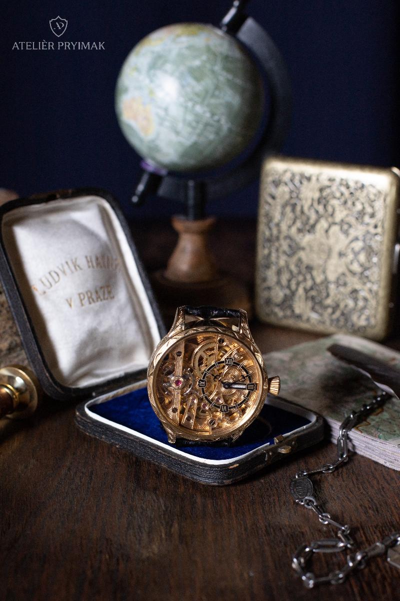 V našem ateliéru specialně pro tyto hodinky bylo odlité nové pouzdro o průměru 48mm z klenotnické mosazi s upravou zlacením a zdobeno ručním rytím ve staročeských tradicích což zajišťuje hodinkám luxusní vzhled a tradiční jedinečnost.