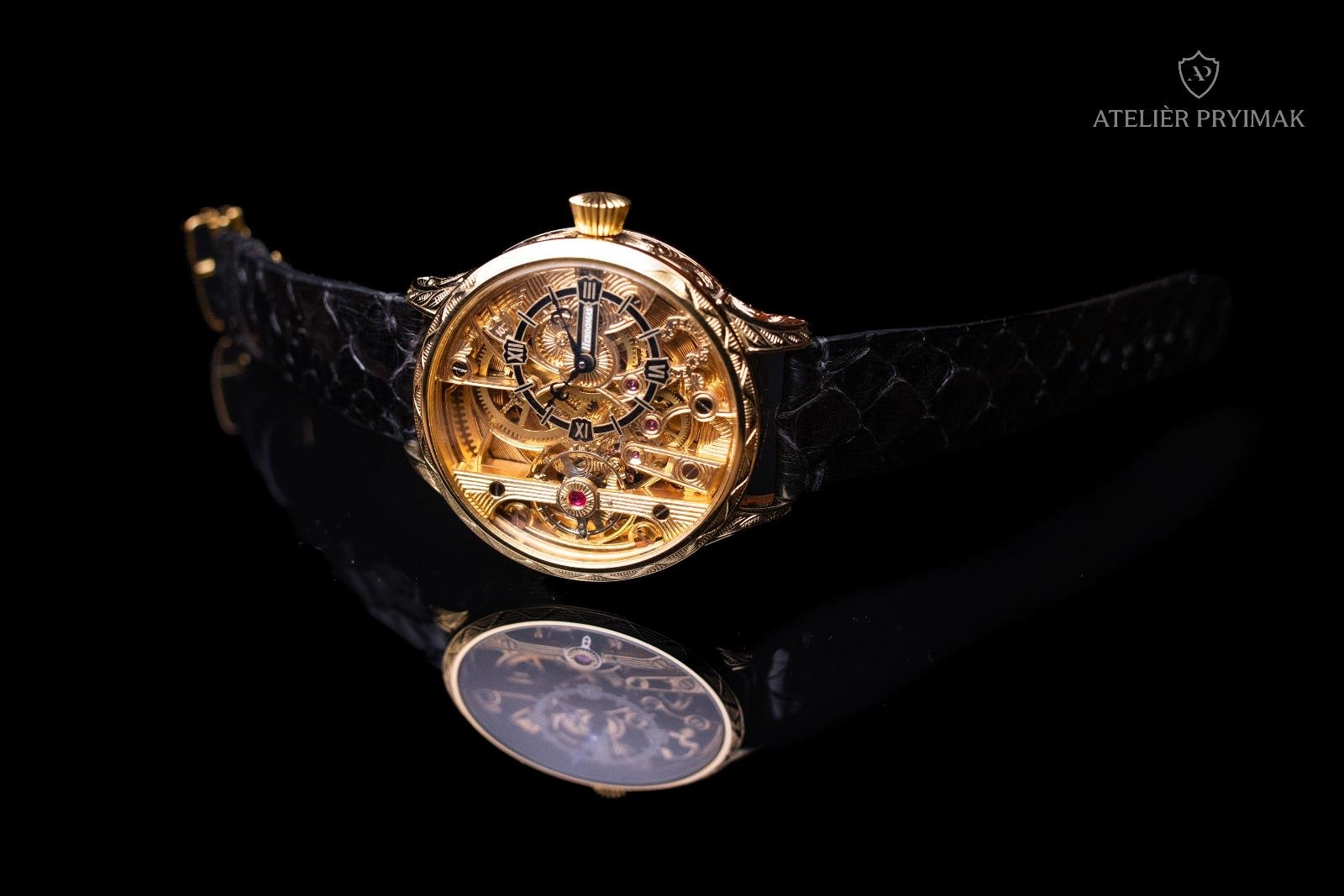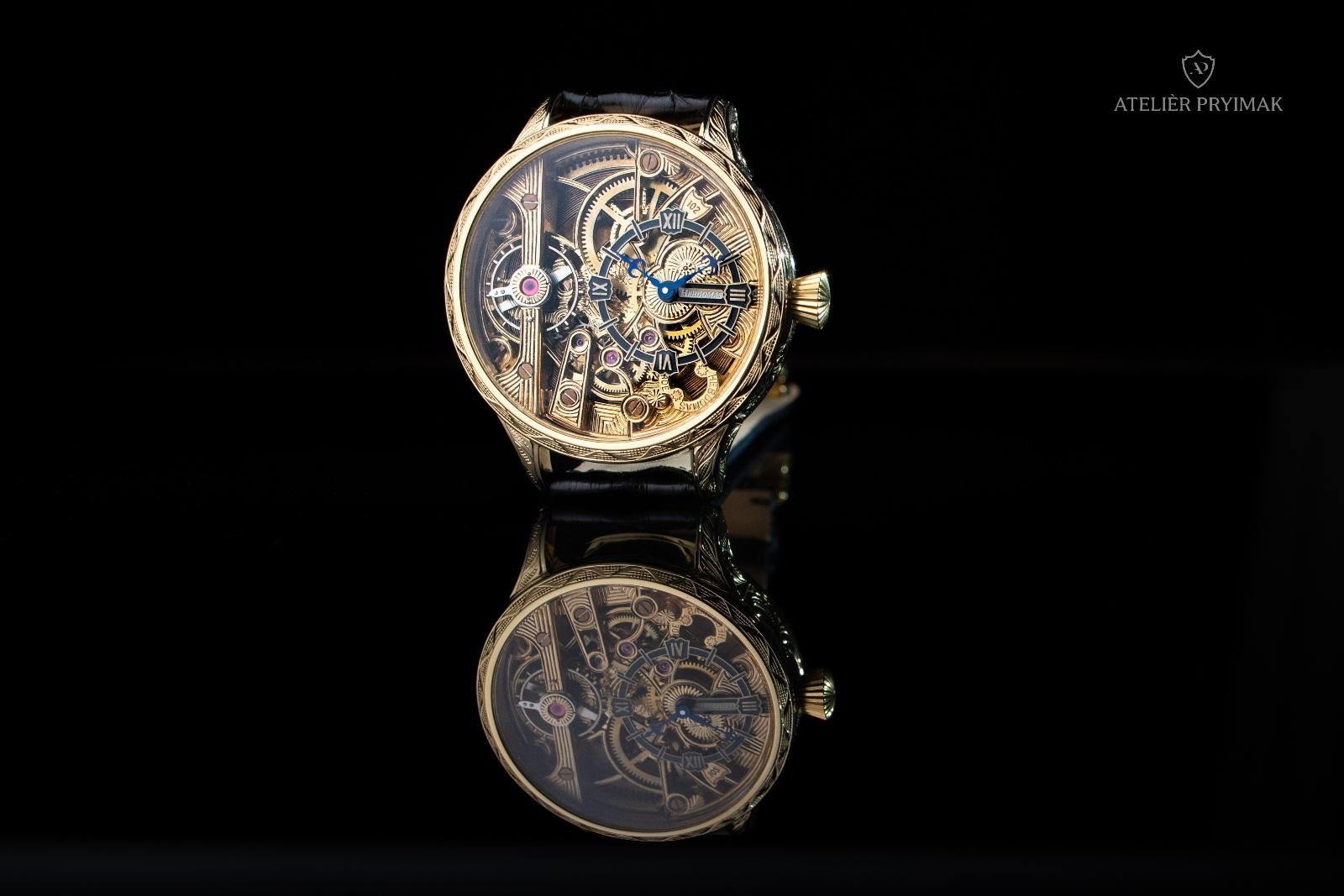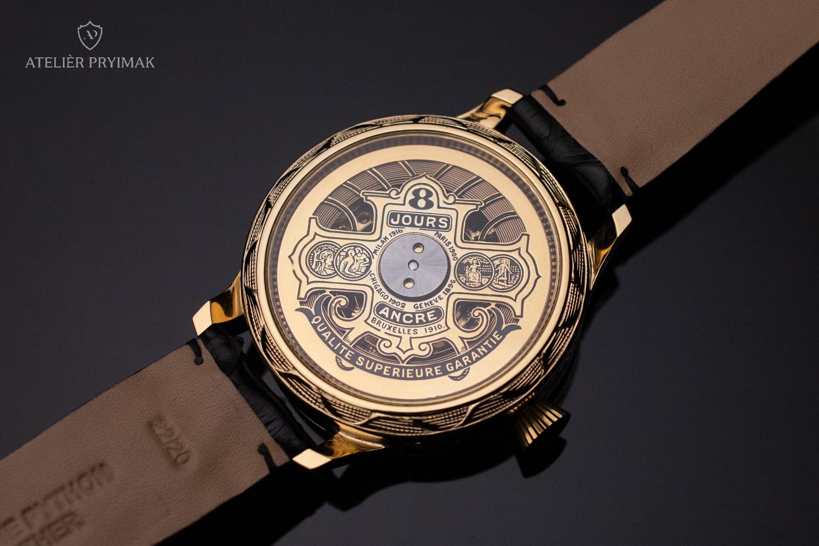 V našem ateliéru specialně pro tyto hodinky bylo odlité nové pouzdro o průměru 48mm z klenotnické mosazi s upravou zlacením a zdobeno ručním rytím ve staročeských tradicích což zajišťuje hodinkám luxusní vzhled a tradiční jedinečnost.