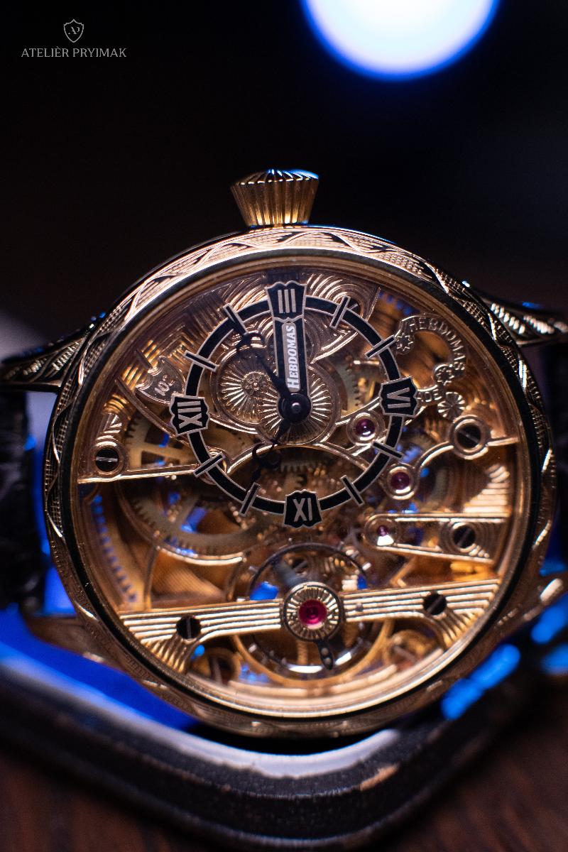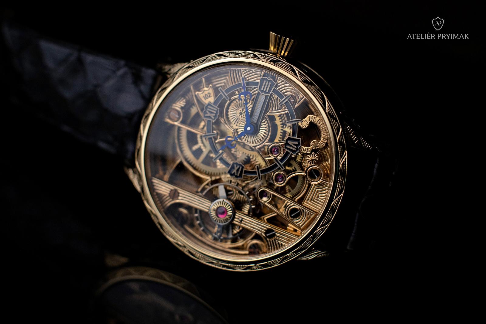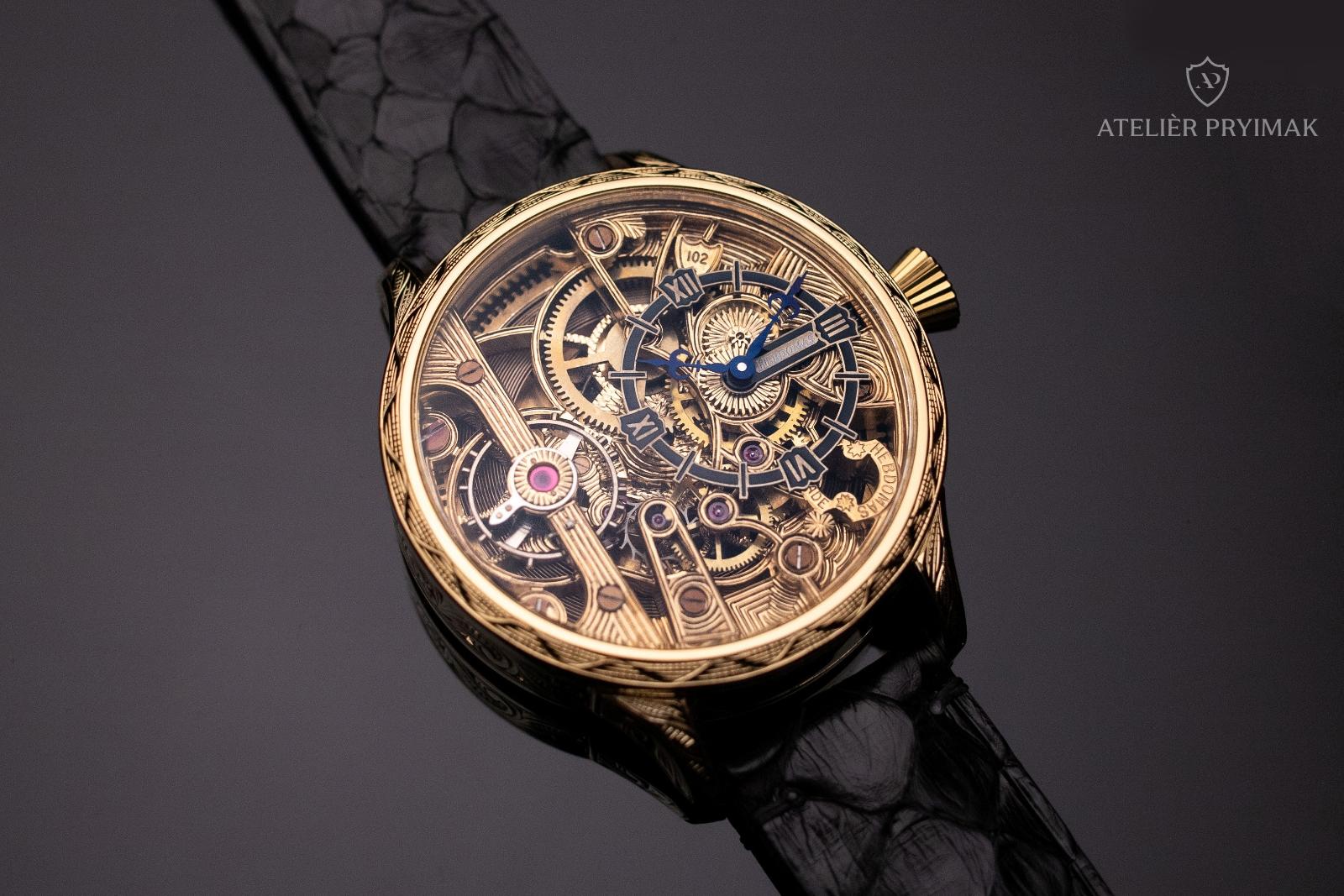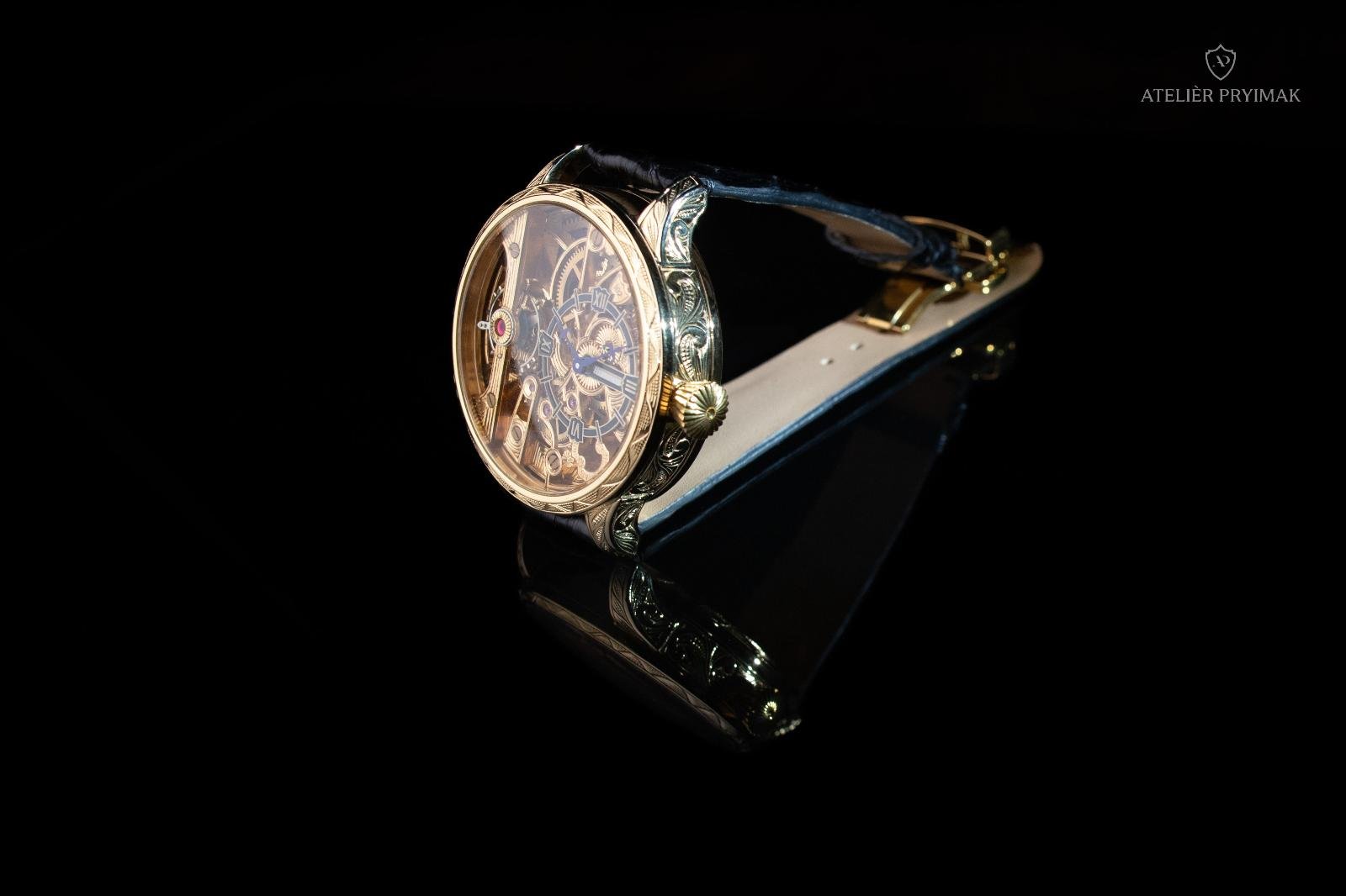 V našem ateliéru specialně pro tyto hodinky bylo odlité nové pouzdro o průměru 48mm z klenotnické mosazi s upravou zlacením a zdobeno ručním rytím ve staročeských tradicích což zajišťuje hodinkám luxusní vzhled a tradiční jedinečnost.