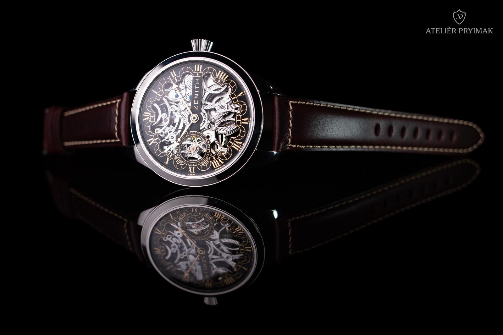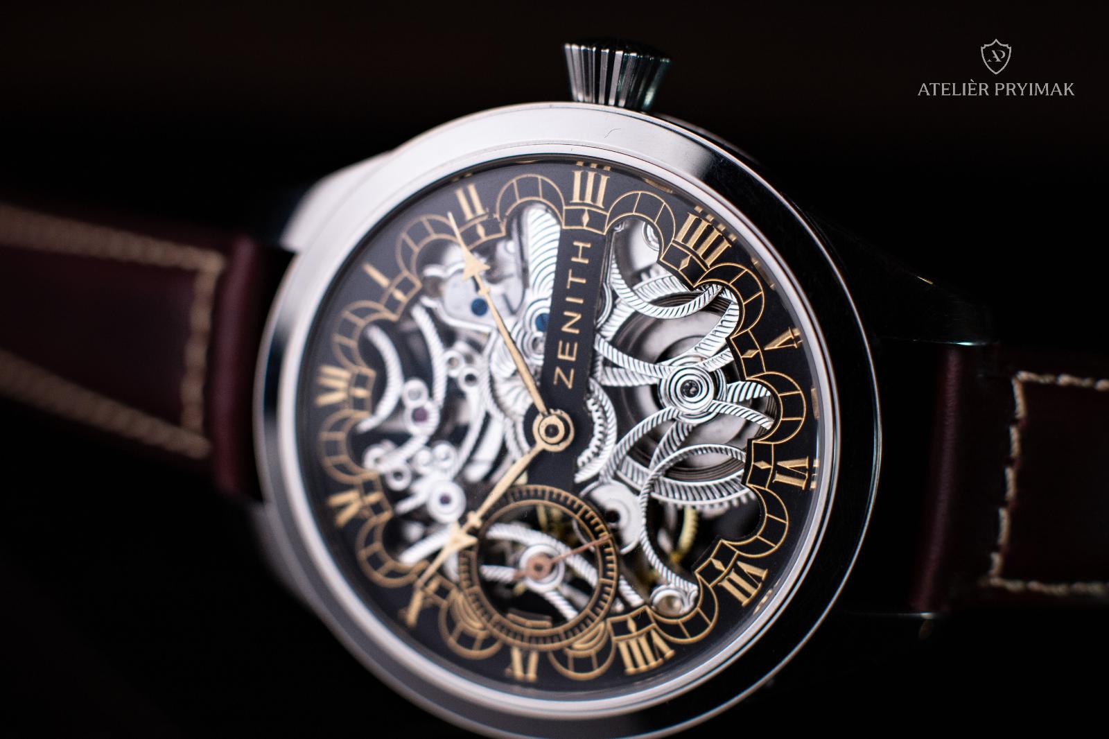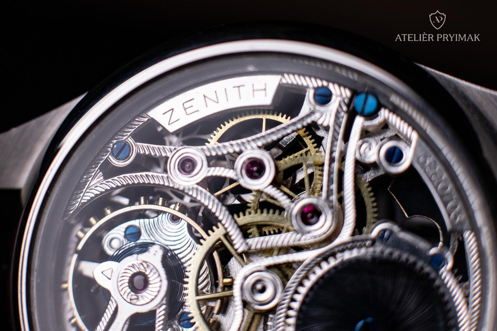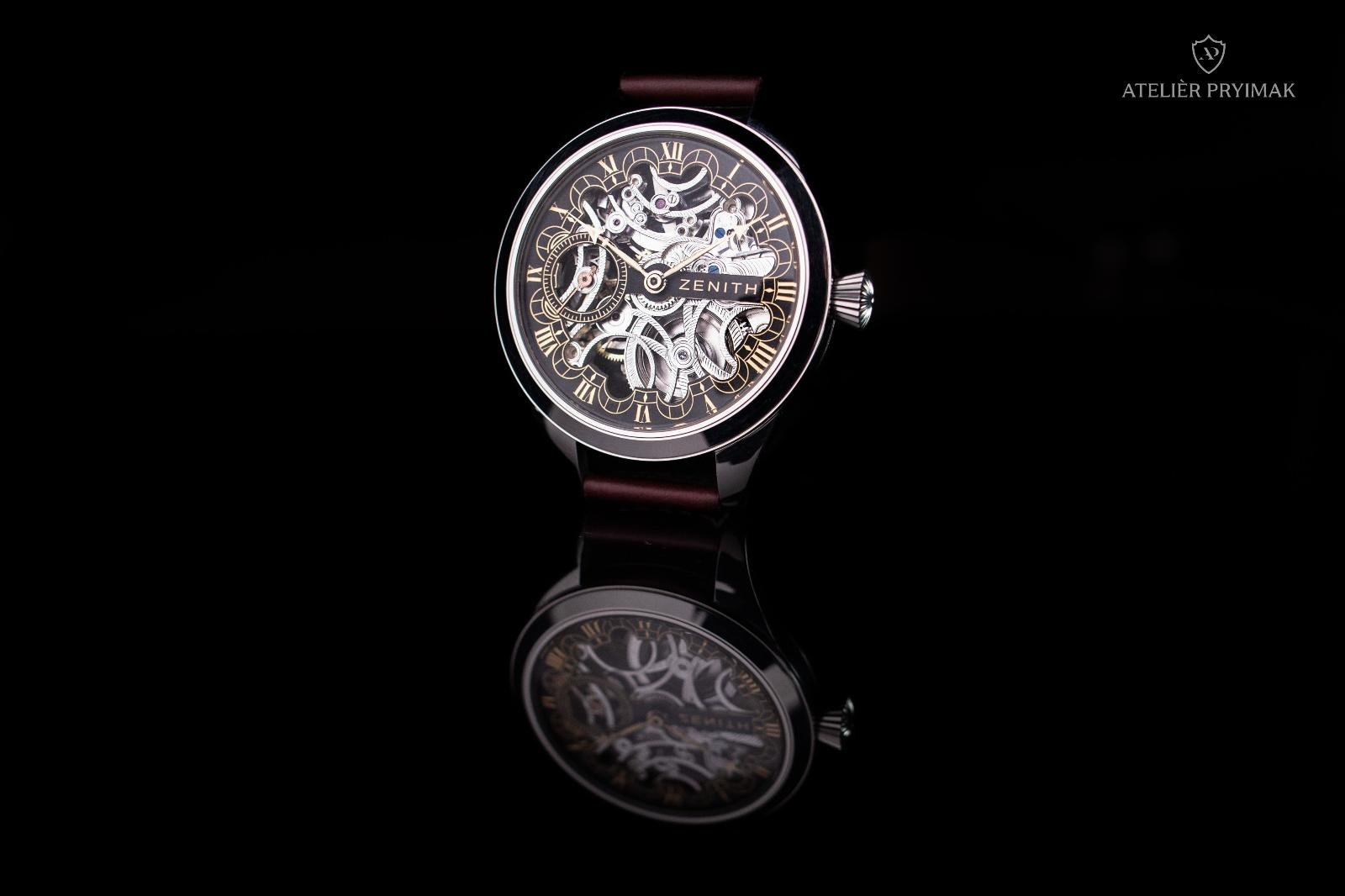 Nabízený mechanický starožitný strojek špičkové švýcarské značky ZENITH se sériovým číslem 3220703, vyrobený v 1938 roce ve Švýcarsku. Byla provedená celková umělecká ruční skeletonizace. Po skeletonizací strojku všechny díly byly upraveny, začištěny, přebroušeny a povrchově upraveny rhodováním a take šroubky byly pokoveny do modra.