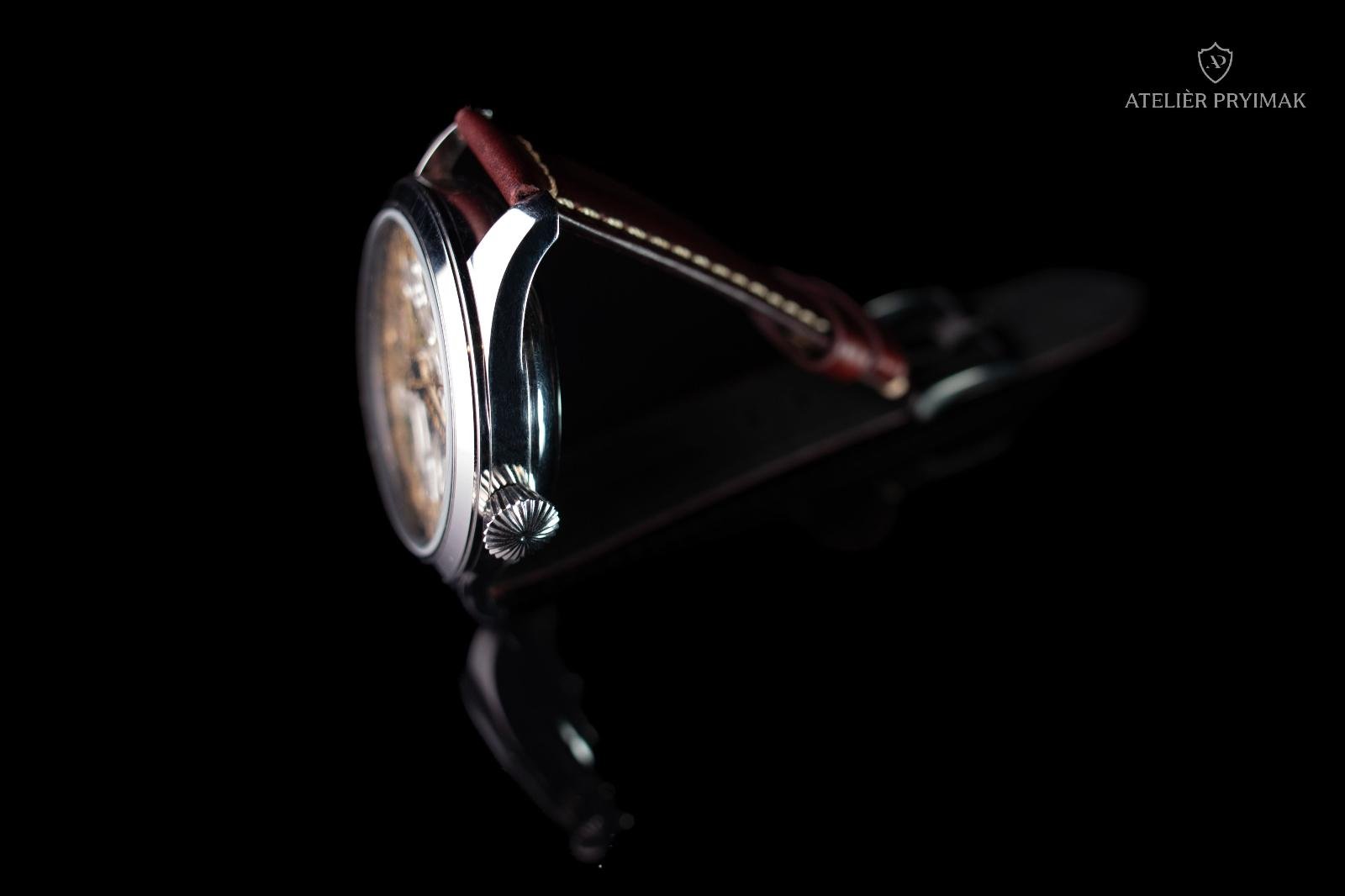Ručně vyrobený skeletový černý ciferník a zlacené římské číslice. Elegantní zlacené ručičky.