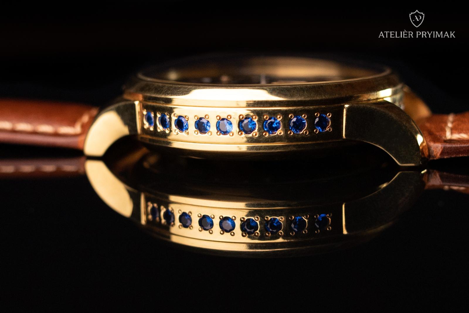 Speciálně pro tyto hodinky bylo v našem ateliéru ručně vyrobeno pouzdro z klenotnické mosazi, zdobené modrými zirkony a zlacením což zajišťuje hodinkám luxusní vzhled a jedinečnost. Průměr hodinek bez korunky 48mm.