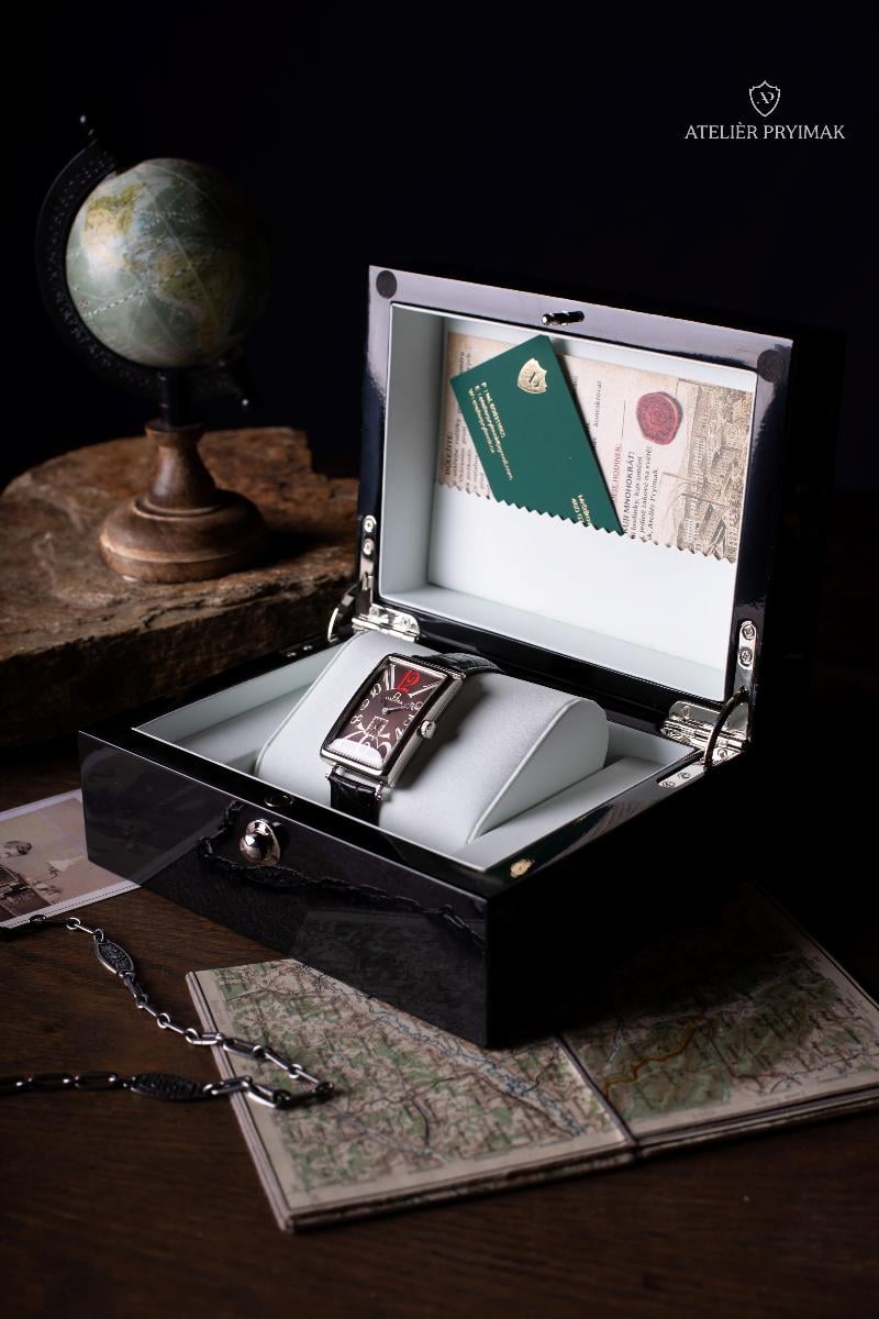 Hodinky jsou dodávány v lakované dřevěné krabičce a mají premiový řemínek z pravé krokodýlí kůže.