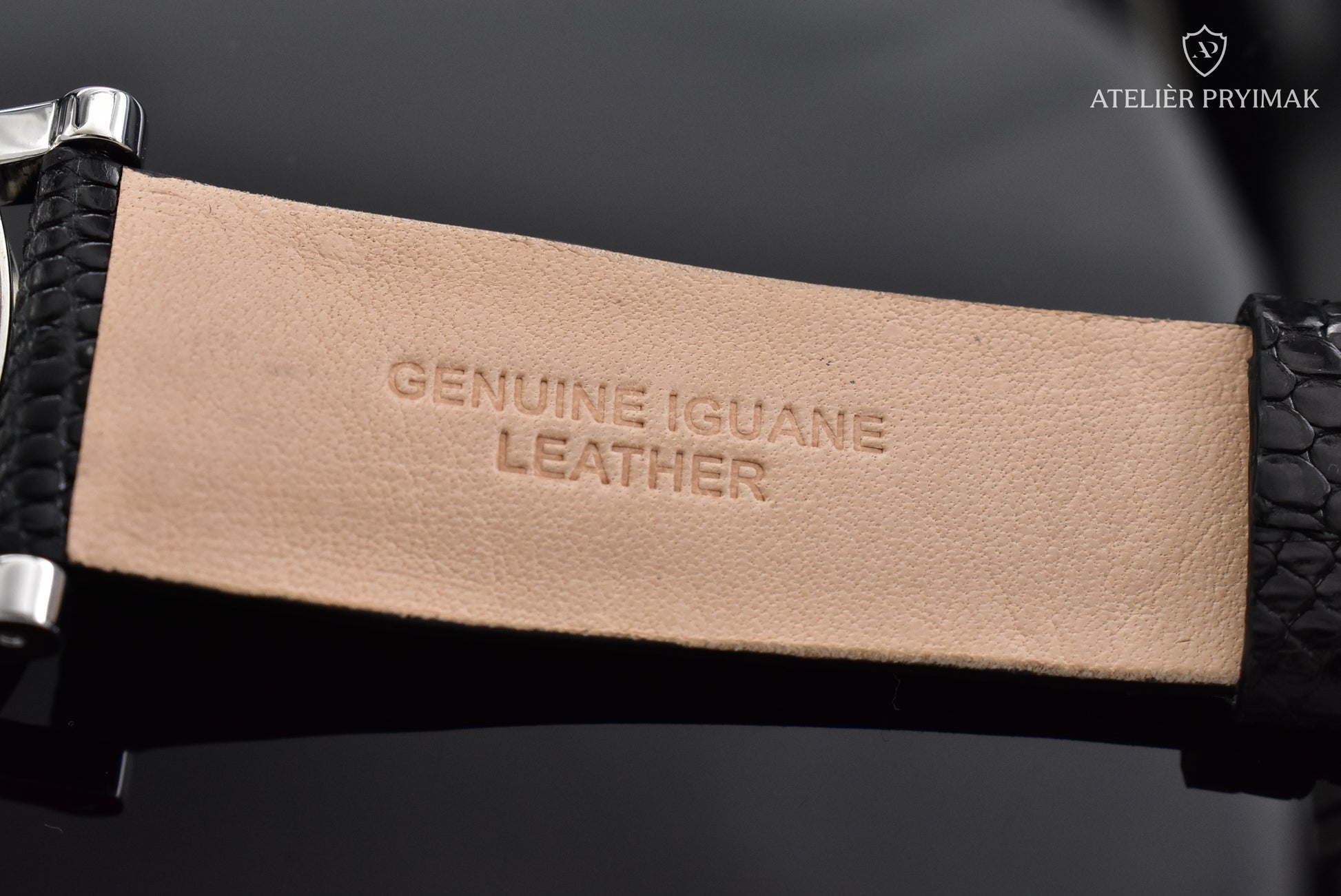 Hodinky jsou opatřeny řemínkem z pravé leguáni kůže ruční výroby.