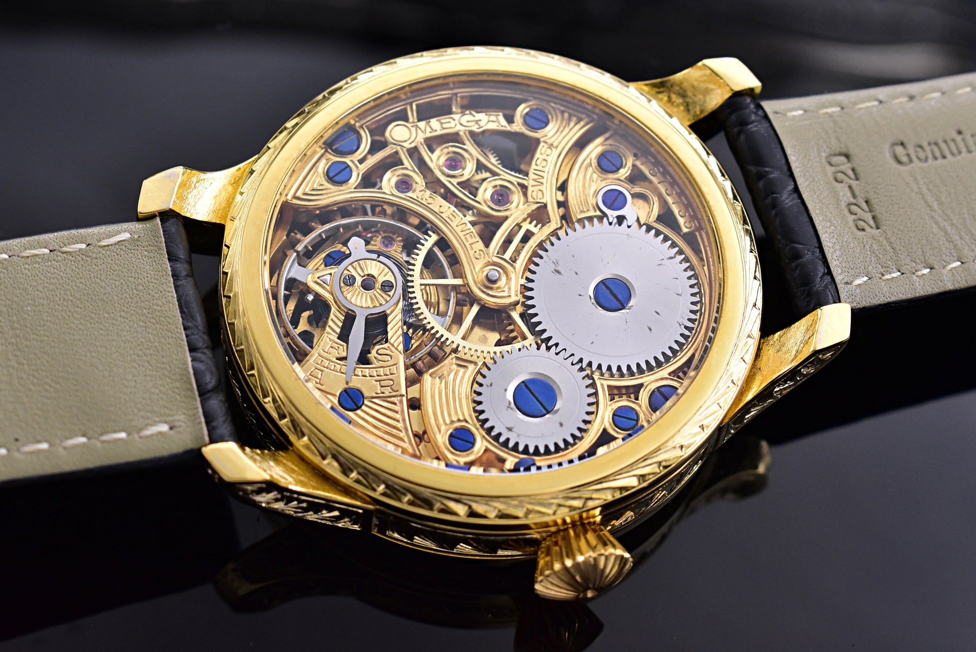 Představuje vám příležitost stát se majitelem jediného exempláře OMEGA "ZBROJAŘ" 1934, tyto hodinky jsou výjimečným kouskem, ručně vyrobeným a existujícím pouze v jednom exempláři. Každá vteřina je cenná – a s těmito hodinkami ještě více. Nabízený mechanický starožitný strojek špičkové švýcarské značky OMEGA kalibru 38,5LT2, se sériovým číslem 7873735, vyrobený v 1934 roce ve Švýcařsku. Byla provedená celková umělecká ruční skeletonizace strojku s vyritím pár křesadlových pistolí. Po skeletonizací strojku všechny díly byly upraveny, začištěny, přebroušeny a povrchově upraveny zlacením. Byla provedená celková skeletonizacé ciferníku a inkrustacé indexy klenotnickymí kameny. Šroubky byly pokoveny do modra. Specialně pro tyto hodinky bylo ručně vyrobené pouzdro z klenotnické mosazi s ručním gravirováním a 24kt zlacením což zajišťuje hodinkám luxusní vzhled a jedinečnost. Hodinky jsou po generalním servisu a jsou přesně jdoucí s průměrem bez korunky 46mm.